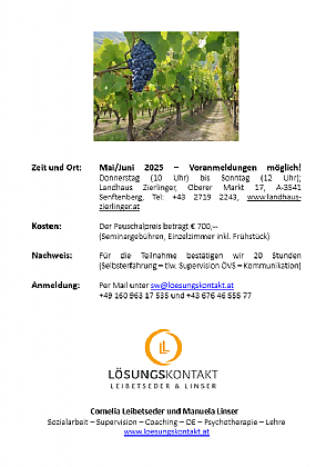 Vertiefend körperliches Erleben und sinnliche Wahrnehmung zulassen und erweitern und somit inneren Freiraum für die eigene Entwicklung schaffen. Eine Reise in meine innere Weite – angeregt durch das milde Klima und die erdige Sinnlichkeit der sanft hügeligen Weinberge, eingebettet zwischen schroffen Felswänden in der mäandernden Flusslandschaft, wo die materiellen Zeugnisse die Jahrhunderte überdauerten – im Vertrauen auf den eigenen Prozess.